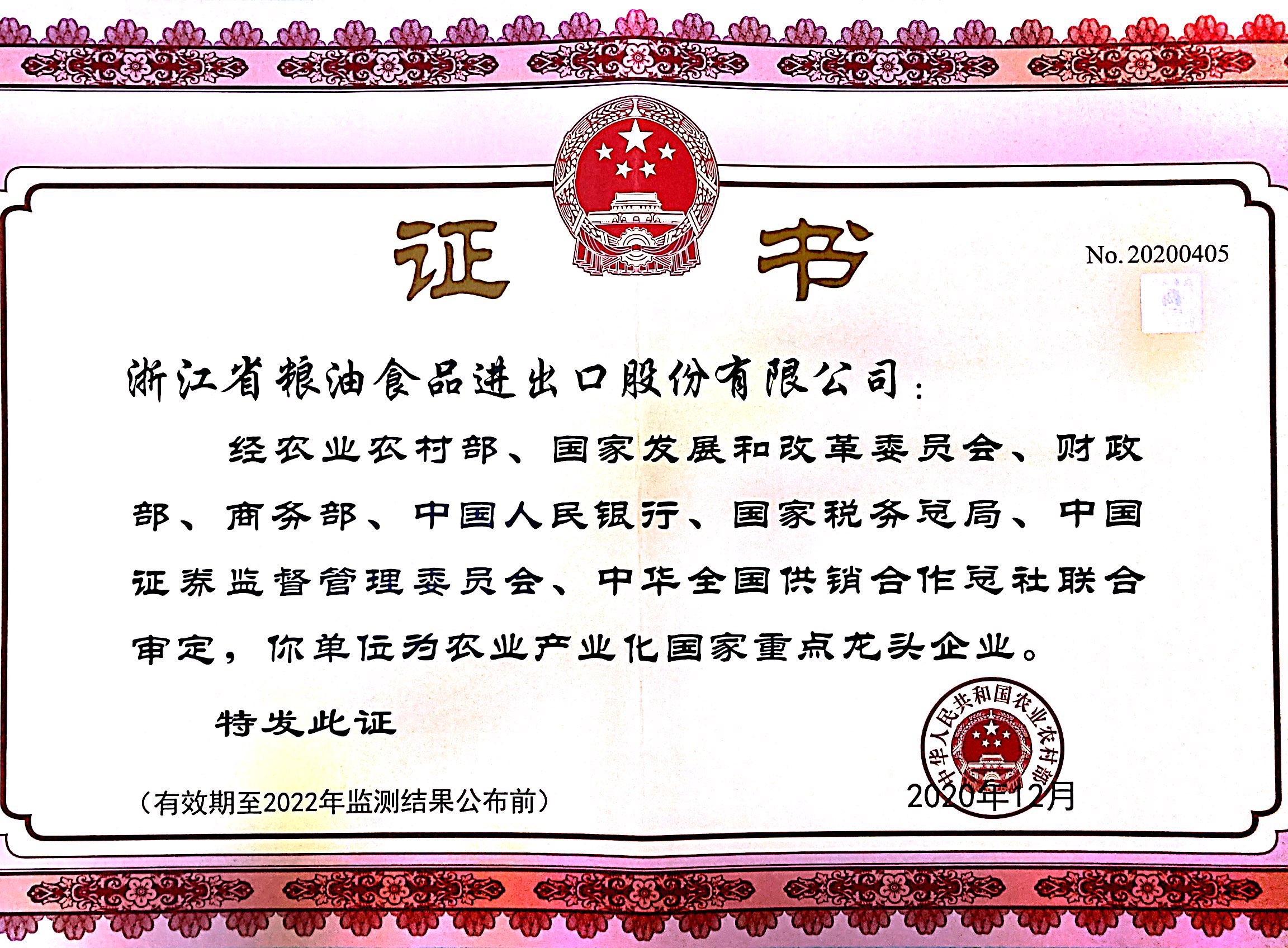 公司與寧波天韻公司通過第九次農(nóng)業(yè)產(chǎn)業(yè)化國家重點(diǎn)龍頭企業(yè)監(jiān)測復(fù)評
